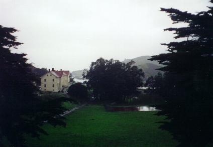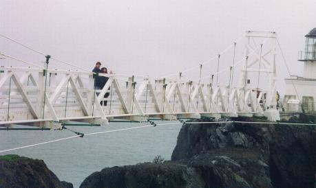 Although it was raining, we went out to the Point Bonita Lighthouse. You had to get to it along a winding path and this suspension bridge which could only hold 5 people at a time. That's Peggy and Ry out on the bridge. |