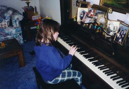 Kelly came to visit Grandma and Grandpa and she read the paper, played the piano and posed with her dad. |