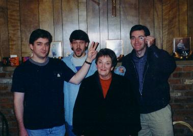 | Peggy's youngest brother, John; Peggy; her oldest brother, Bill; and her sister, Mary, at Aunt Wootie's birthday in 1996. |