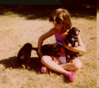 Our first foster "children". We got them July 21, 1999. They were 3-1/2 week old Border Collie/Mountain Dog mix. 2 girls and a boy. Shown here with our granddaughter, Kelly. We had them for 2 weeks until August 4, 1999. |
