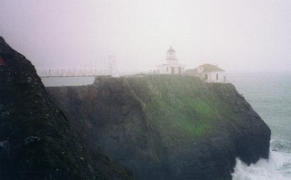 Although it was raining, we went out to the Point Bonita Lighthouse. You had to get to it along a winding path and this suspension bridge which could only hold 5 people at a time. That's Peggy and Ry out on the bridge. |