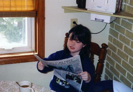 Kelly came to visit Grandma and Grandpa and she read the paper, played the piano and posed with her dad. |
