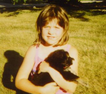 Our first foster "children". We got them July 21, 1999. They were 3-1/2 week old Border Collie/Mountain Dog mix. 2 girls and a boy. Shown here with our granddaughter, Kelly. We had them for 2 weeks until August 4, 1999. |