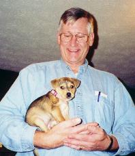 Proud Dad with our November '99 foster child. This one was a 4 week old Beagle-Hound mix female. We had her from November 8 - 19, 1999. |