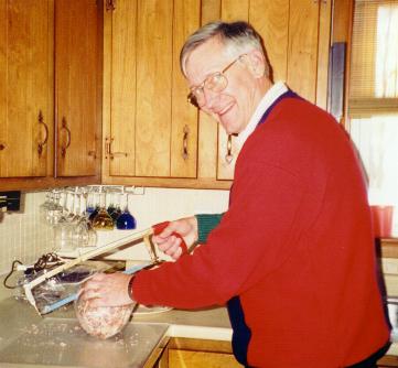 Dad with the Grateful Dad shirt from Ryan and then trying to cut the frozen ham in half with a hack saw. |